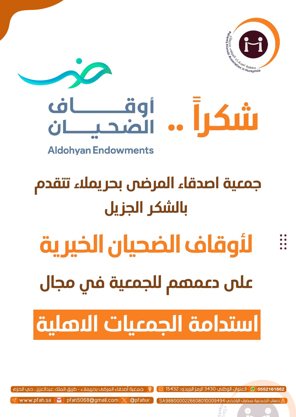 بدأت الجمعية في الإجراءات اللازمة للقيام بعملها في خدمة المرضى. استأجرت مبنى في وسط المحافظة وسجلت عنوانها الوطني. ثم اكملت متطلبات الحوكمة حسب طلب المركز الوطني لتنمية القطاع غير الربحي.